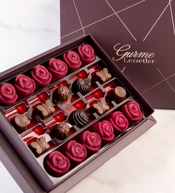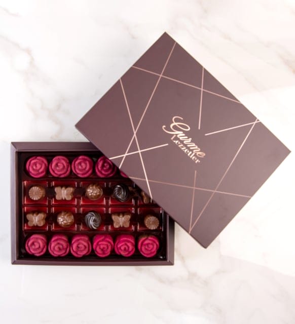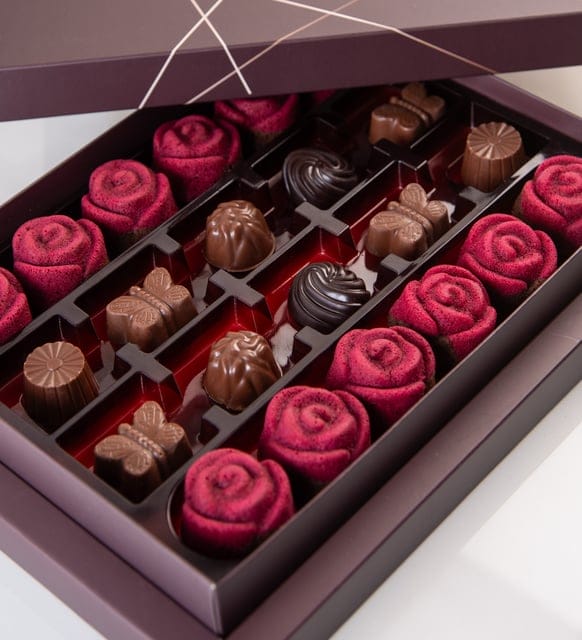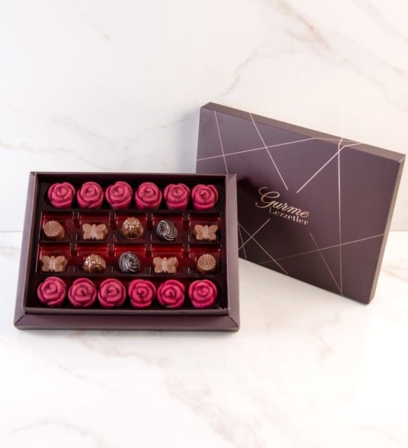 جوز الهند، الحليب، شوكولاتة بونبون الداكنة وشوكولاتة الكراميل المملح في صندوق زهور بتصميم خاص 210 جرام