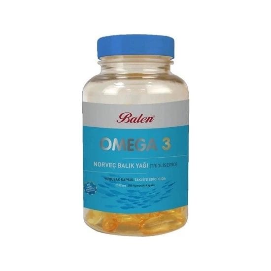 Balen Omega 3 – زيت سمك نرويجي بتركيز 1380 ملغ، 200 كبسولة (تريجليسيريد). تم استخدام الجيلاتين البقري المعتمد من TSE Halal للإنتاج في تركيا.