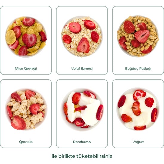 يمكن تناول الفراولة المجففة مع الزبادي، الحليب، الآيس كريم، الموسلي، الجرانولا، رقائق الذرة، ونفحات القمح.