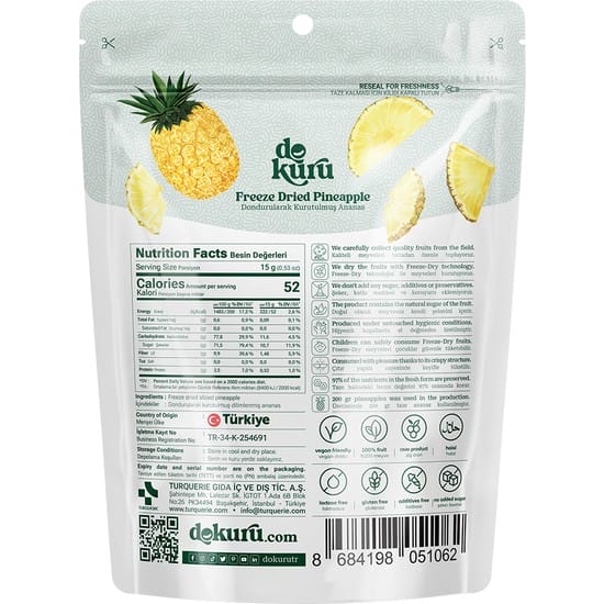 – المكونات: أناناس طبيعي مجفف بالتجميد.