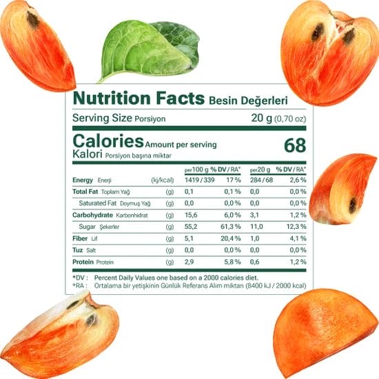 – المكونات: برسيمون طبيعي مجفف بالتجميد.