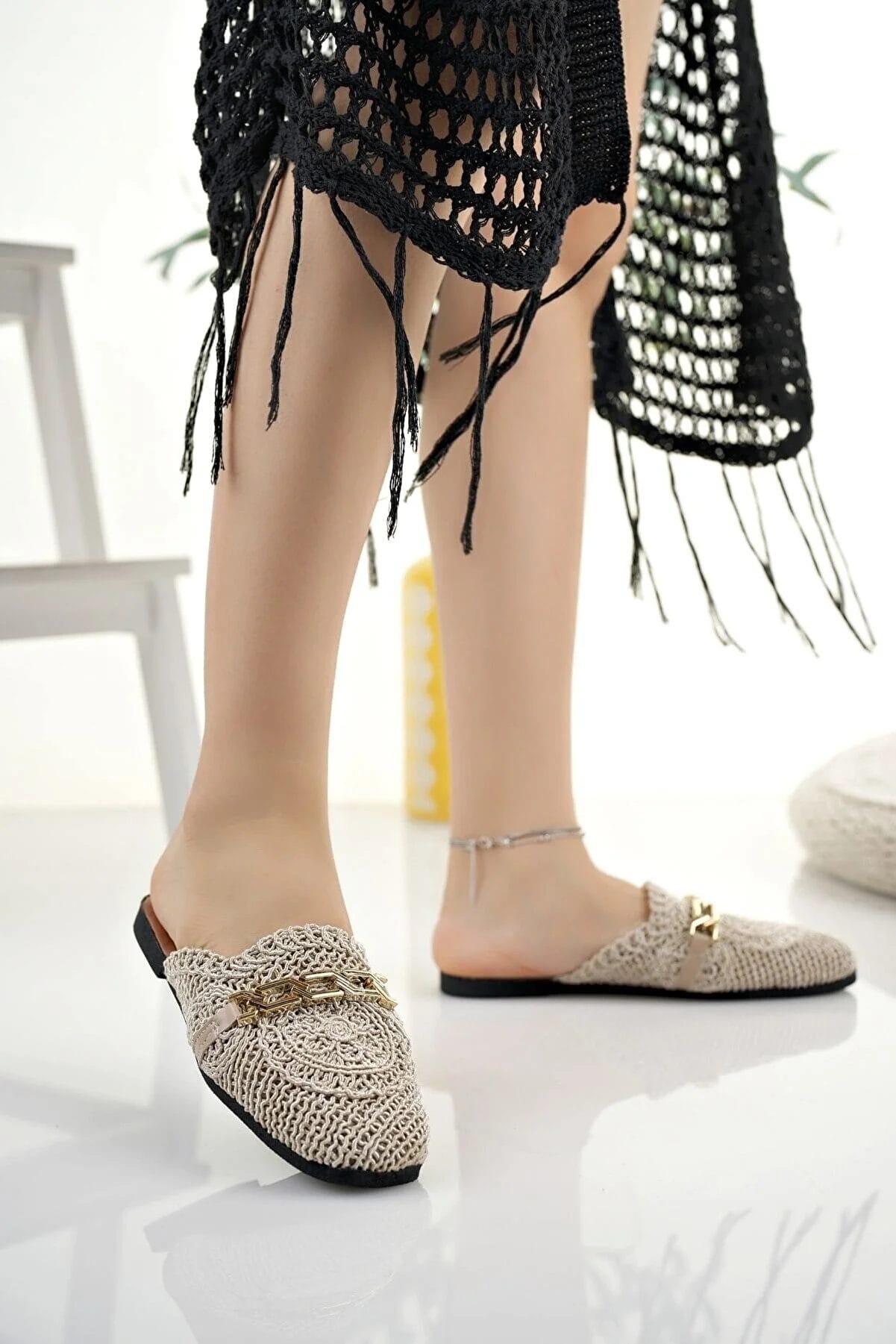شبشب نسائي من القش مغلق من الأمام دانتيل بيج محبوك مطرز مهر من مودافرسات