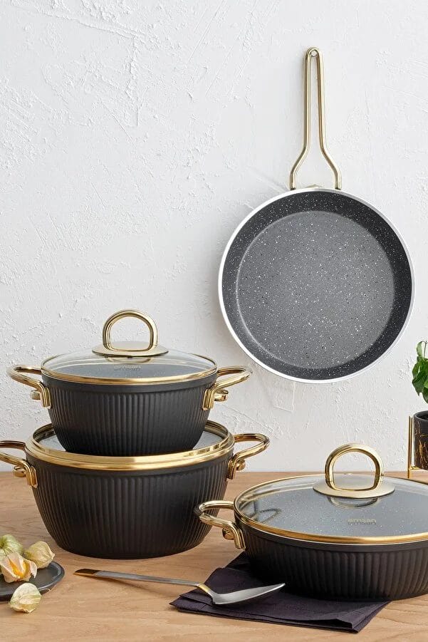 طقم أواني طهي جرانيت 7 قطع باللون الأسود والذهبي من ماركة إمسان التركية