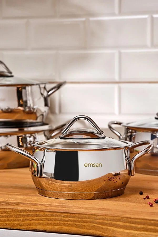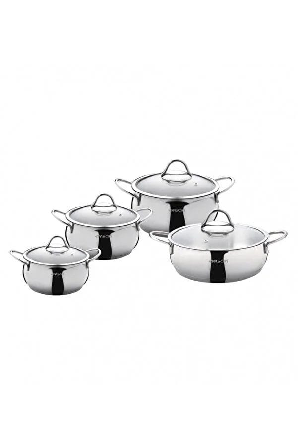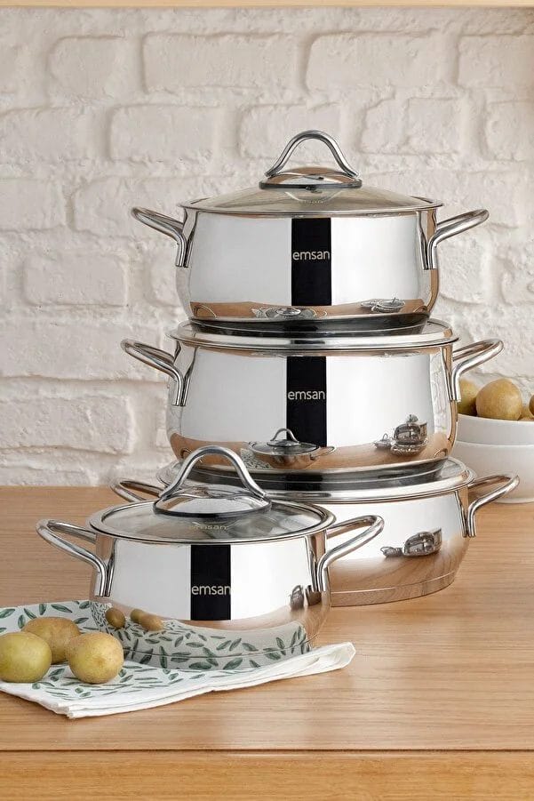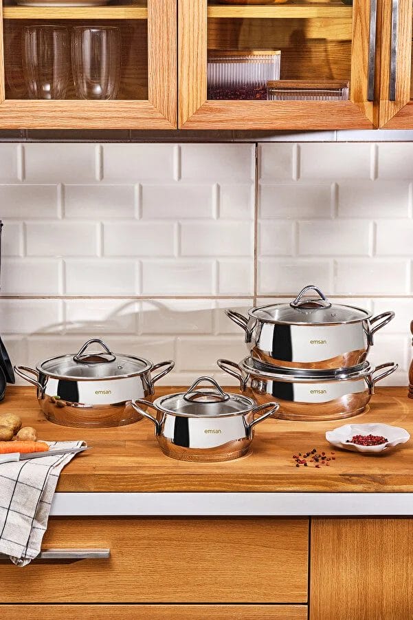 مجموعة مقالي الطهي من امسان التركية المكونة من 8 قطع، التي تتميز بالمتانة والفعالية في الاستخدام. يمكن استخدام هذه المجموعة لإعداد وجبات صحية ولذيذة، حيث تساعد القدور ذات الهياكل الفولاذية في الحفاظ على نكهات وخصائص المكونات الرئيسية مثل الخضار واللحوم والبقول دون فقدان كبير. تم تصنيع مجموعة القدور من الفولاذ المقاوم للصدأ، وتتمتع بخاصية قابلية التنظيف في اليد وفي غسالة الصحون.