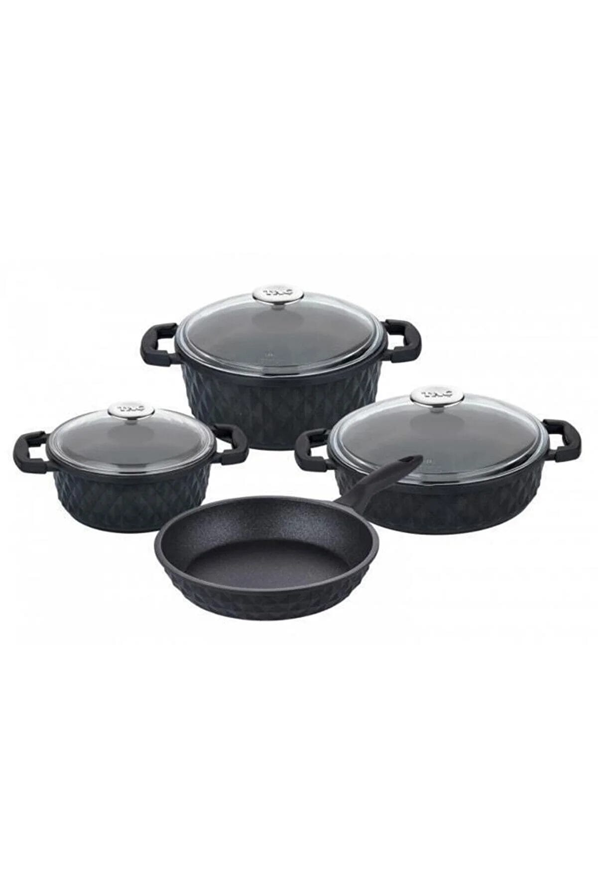 طقم أواني طهي مكون من 7 قطع مع غطاء زجاجي مصبوب باللون الأسود من ماركة تاج