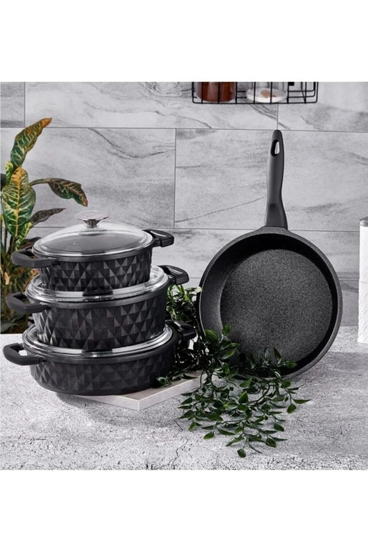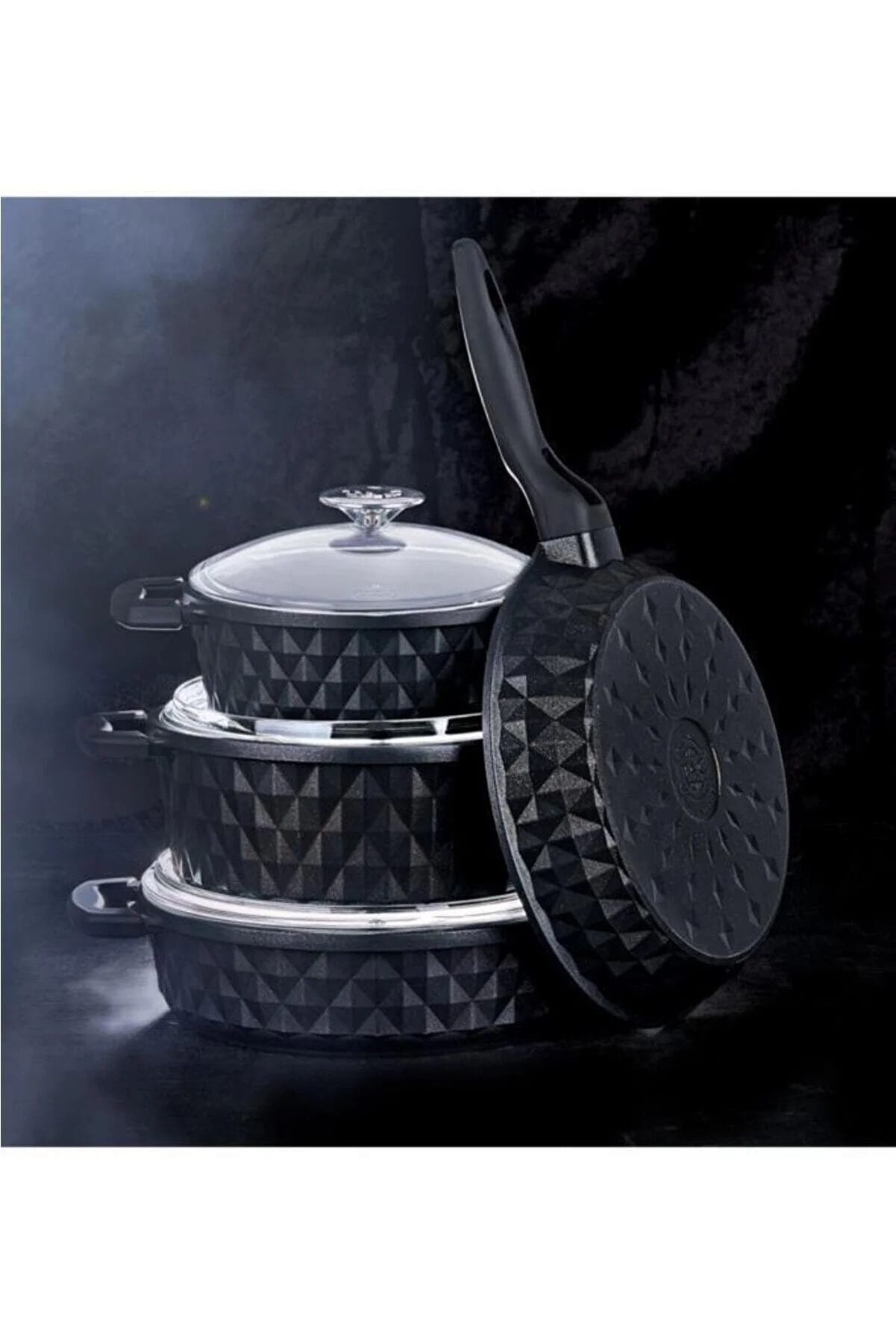 Home » المتجر » طقم أواني طهي مكون من 7 قطع مع غطاء زجاجي مصبوب باللون الأسود من ماركة تاج