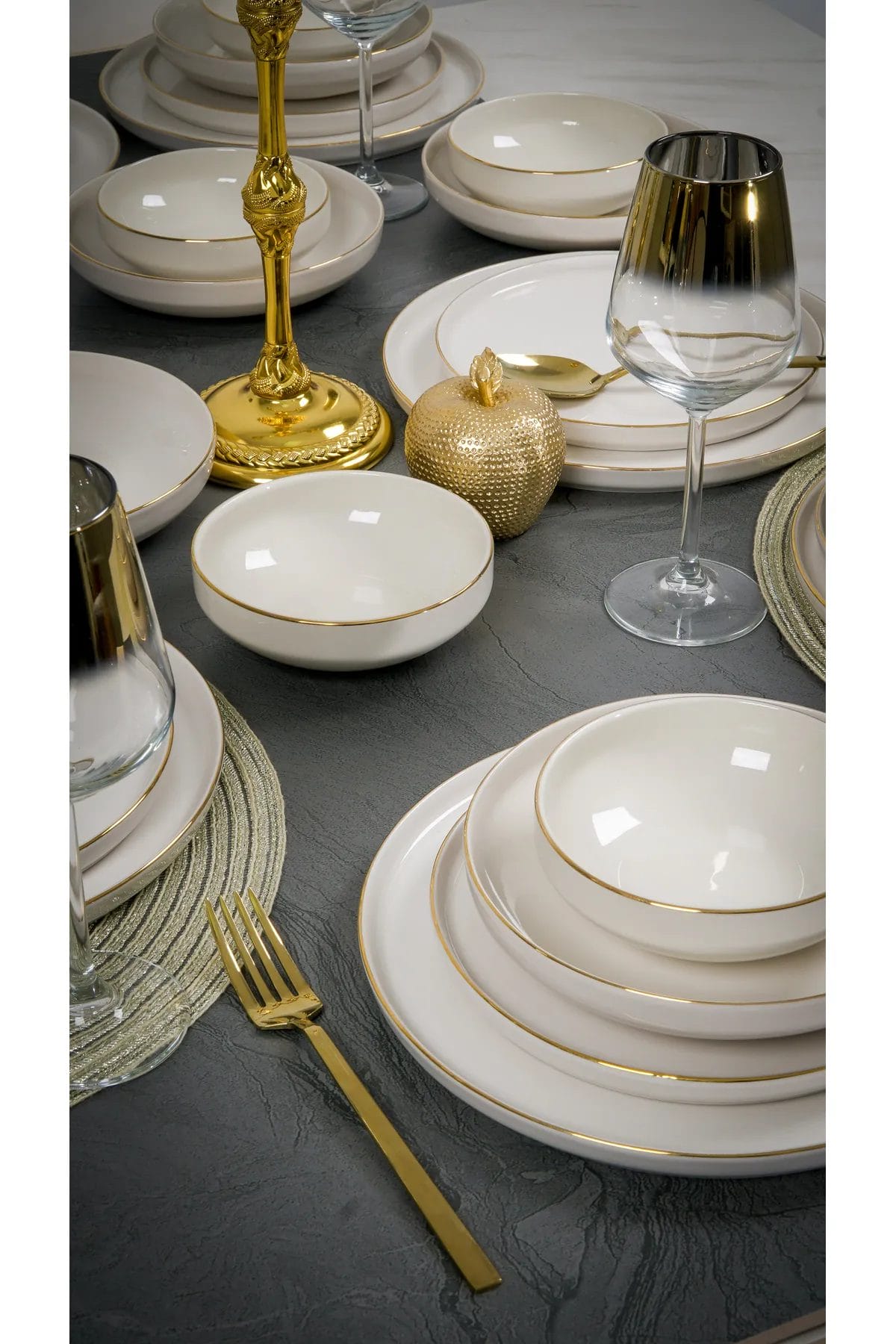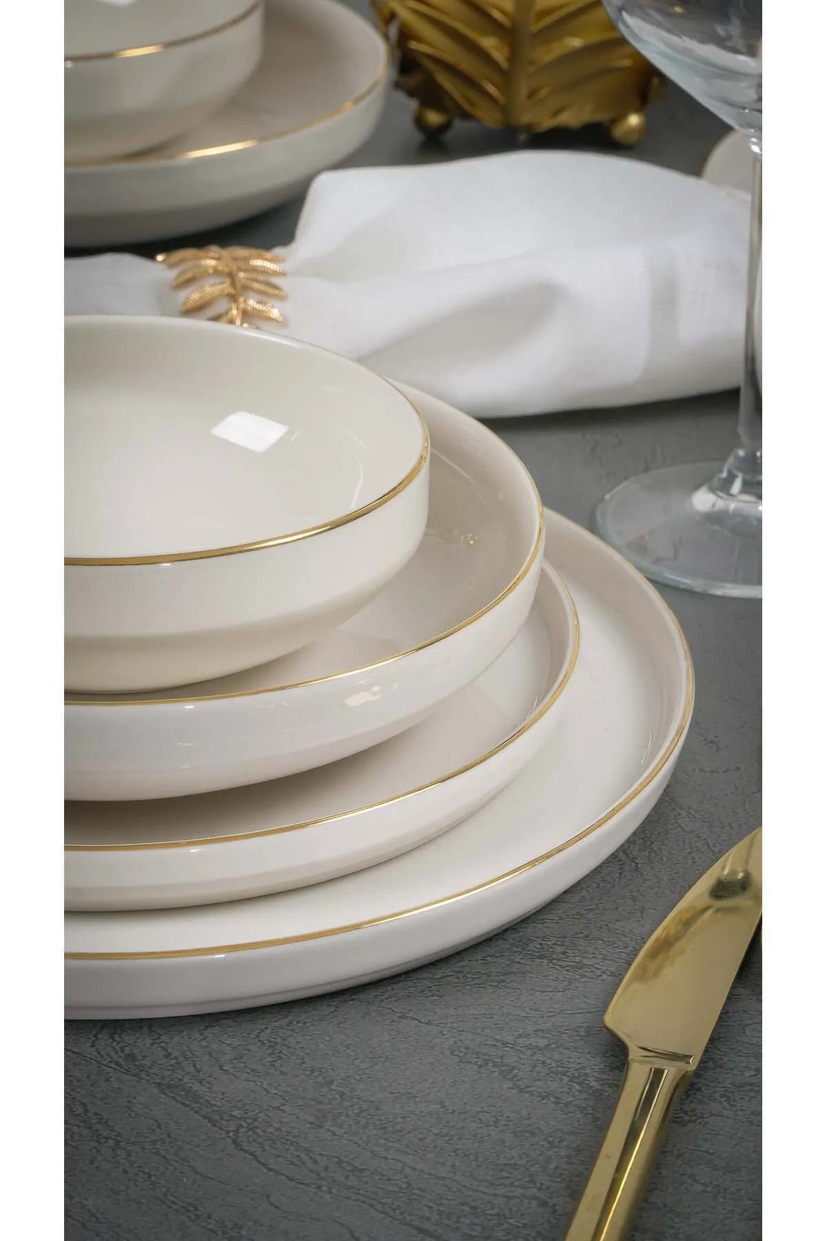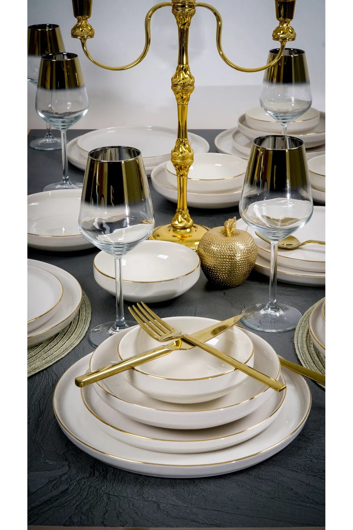 استمتع بأناقة لا مثيل لها وبساطة راقية مع مجموعة أطباق العشاء من البورسلين المطلية بالذهب الحقيقي. تجمع هذه المجموعة بين الجمال البسيط والتصميم الأنيق لتضفي لمسة من الفخامة على تجربة تناول الطعام.