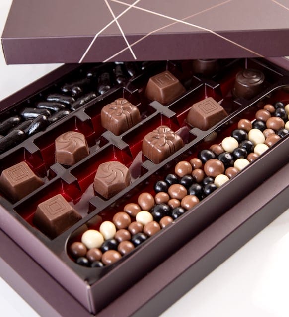 شوكولاتة الحليب والشوكولاتة الداكنة الذواقة في صندوق مربع 195 جرام السعر الأصلي هو: $57,02.السعر الحالي هو: $37,06.