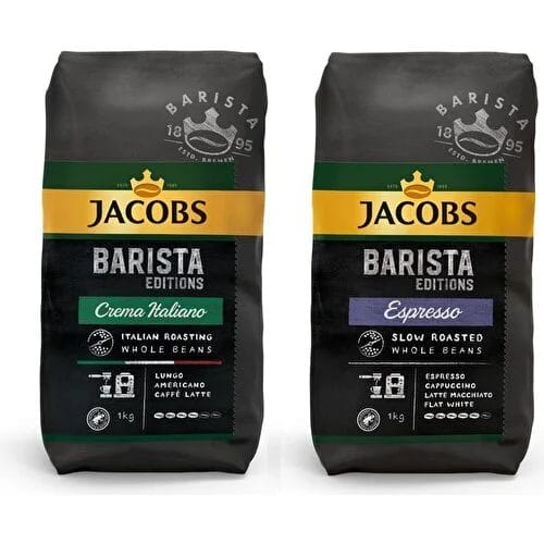 جاكوبس – إصدارات الباريستا – حبوب البن – كريما إيطالية – كثافة عالية – تحميص ببطء – 1 كجم + جاكوبس – إصدارات الباريستا – حبوب البن – ٪100 أرابيكا – إسبريسو – كثافة عالية – تحميص ببطء – 1 كجم