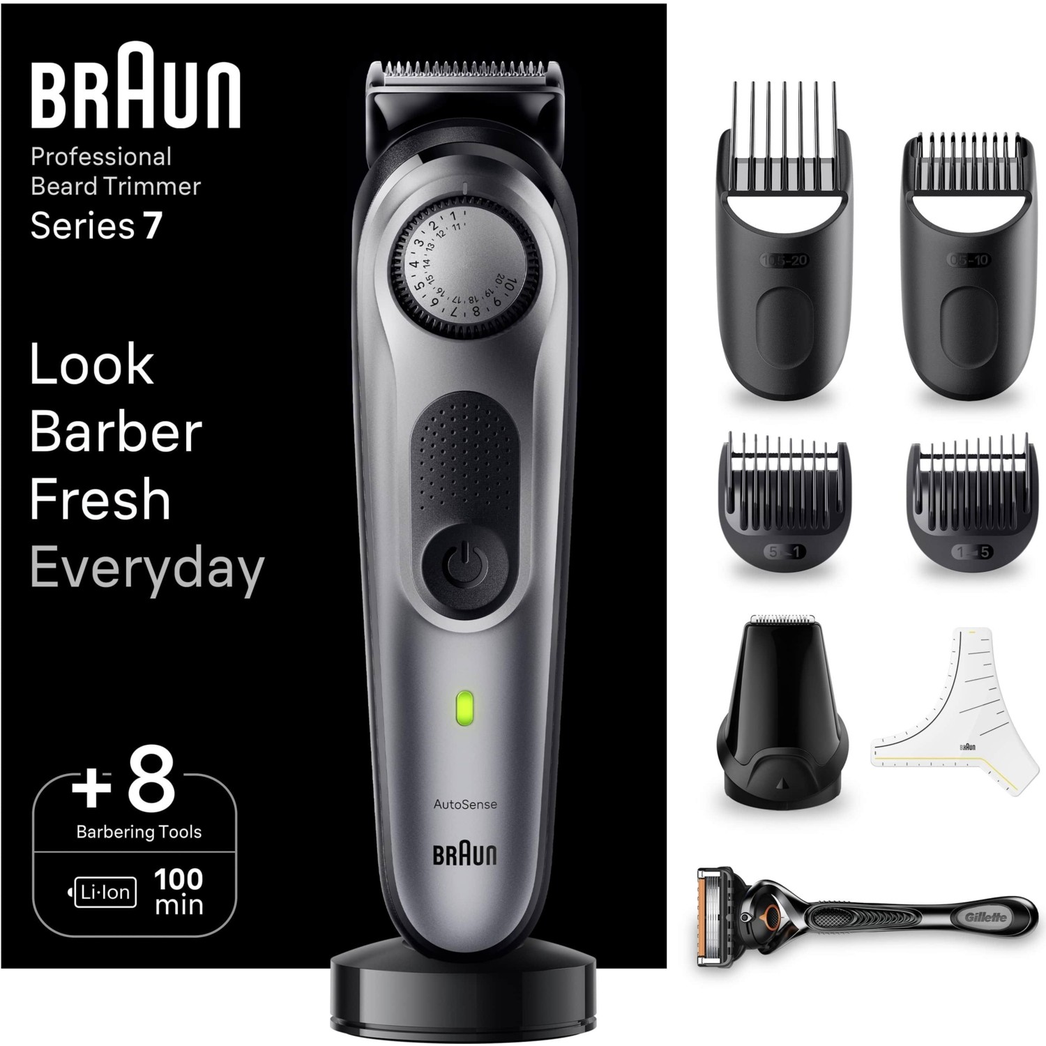 براون 7 – الجهاز المحترف لتصفيف اللحية، لتبديل شكلك يومياً كما لو كنت قد خرجت للتو من صالون الحلاقة: يقدم جهاز براون 7 لتصفيف اللحية 7 أفضل مستوى من الدقة والتحكم بنسبة 100٪.