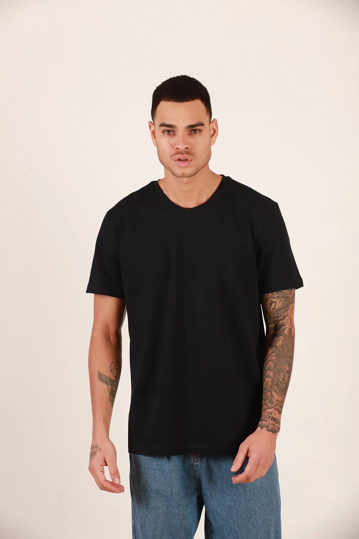 تي شيرت أساسي سادة مكون من 4 قطع - أسود ورمادي وأبيض وأزرق فاتح برقبة دائرية كبيرة الحجم من بوتيك دوبو